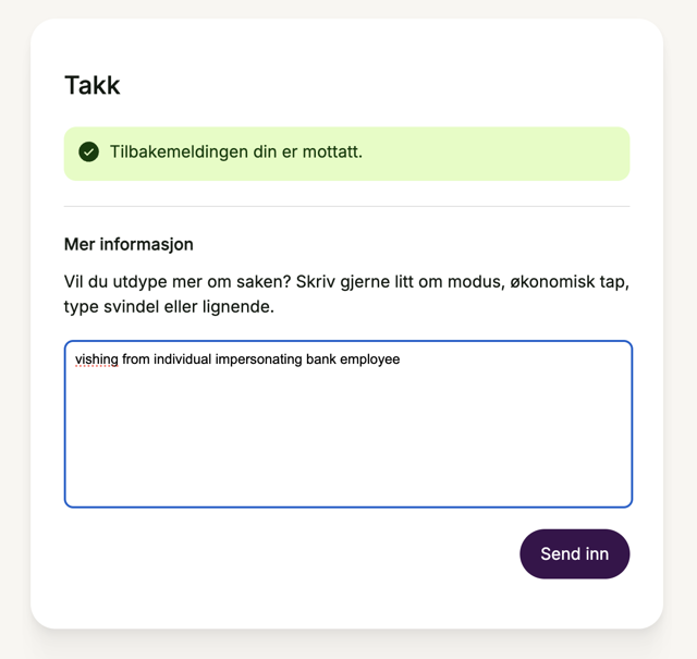 Textual description of the fraud case. This is manually reviewed by analysts and used to augment insight into general fraud trends. | "klarna phishing", "vishing from individual impersonating bank employee" |